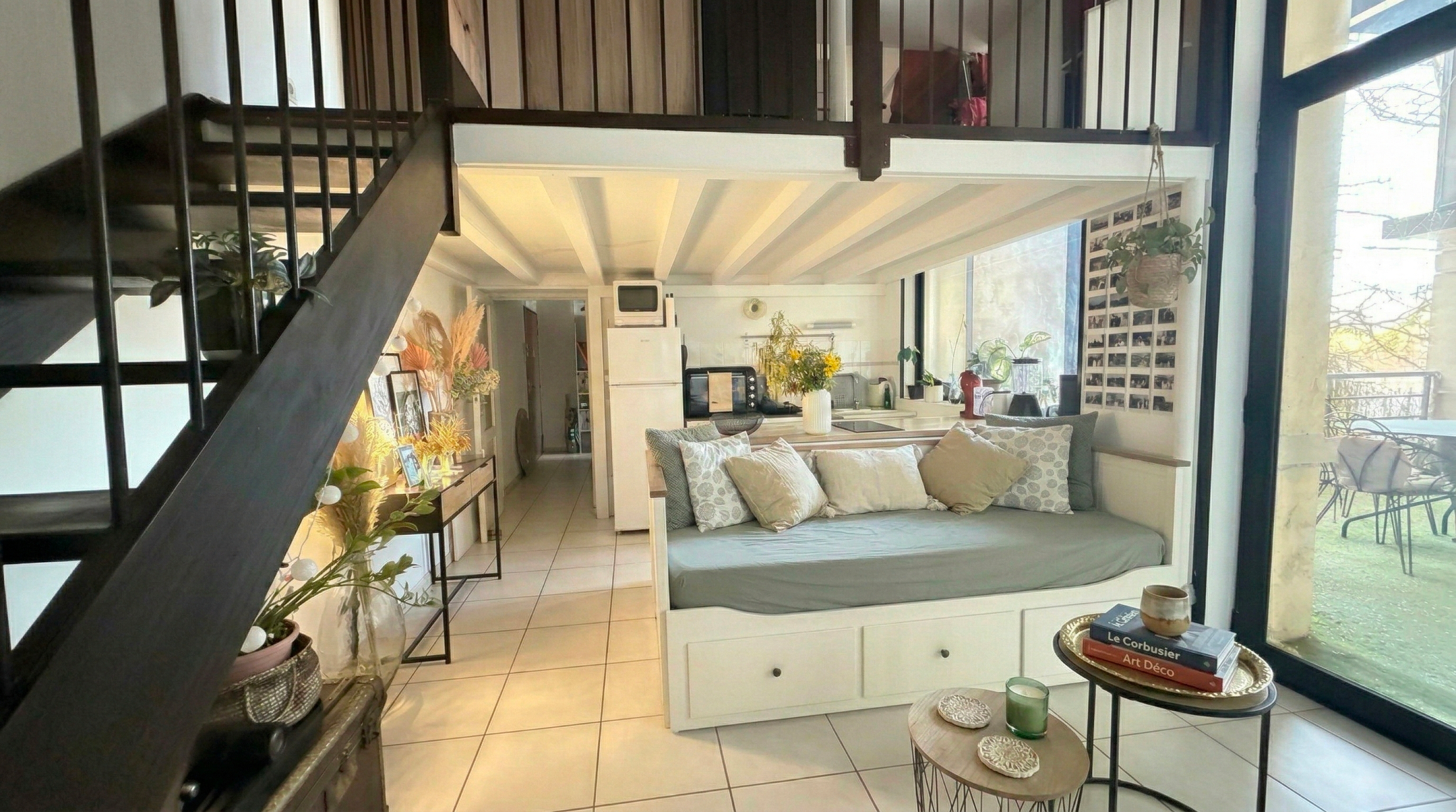 Un coin lecture cosy surplombant le séjour.